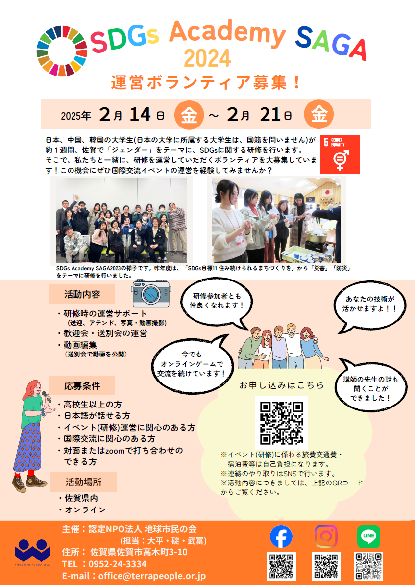 佐賀で40年以上活動を続けるNPO法人地球市民の会は、2月に”SDGs Academy SAGA”を実施します。