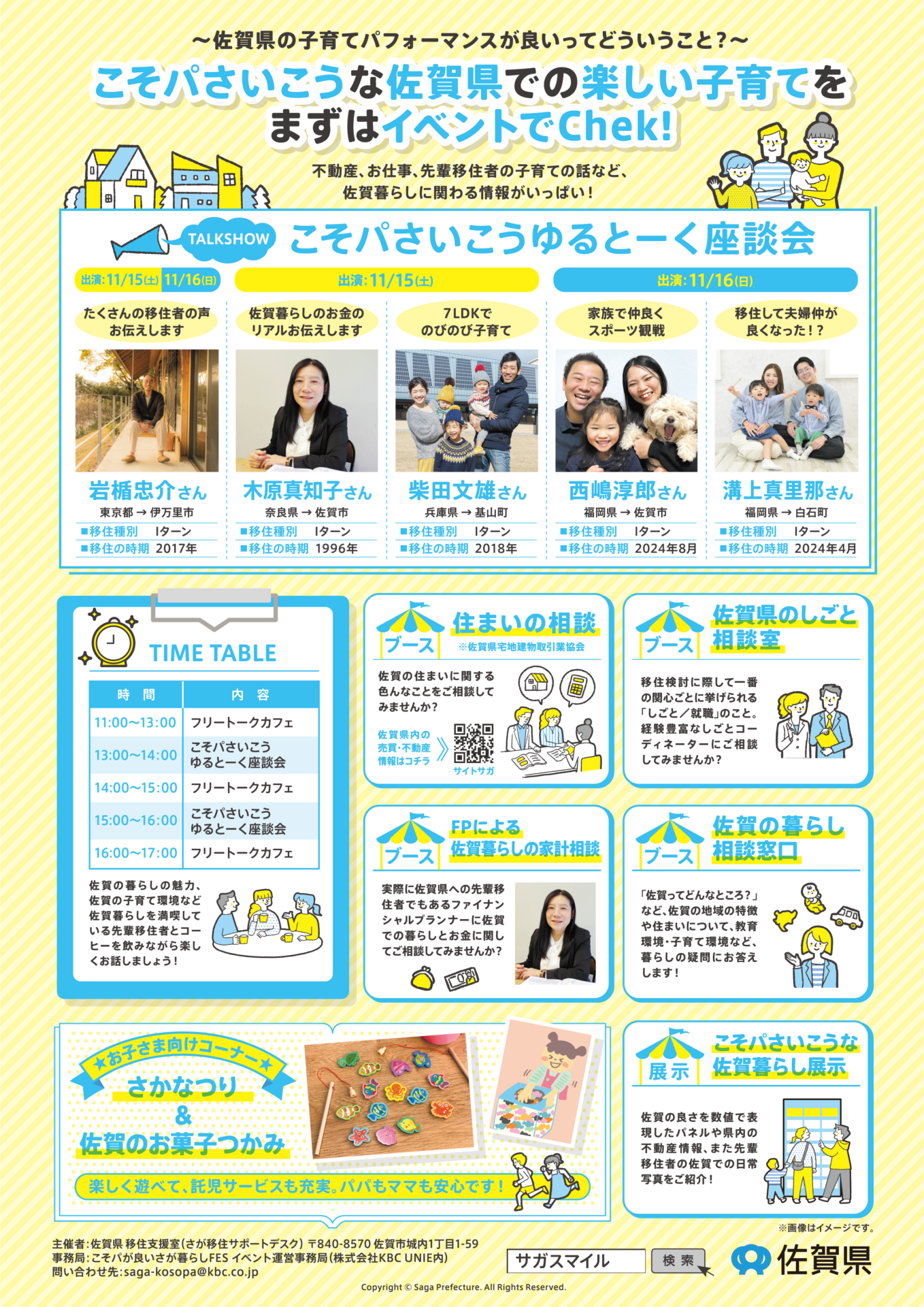 無料の親子撮影会や住まいの相談、お仕事相談、ファイナンシャルプランナーによる佐賀暮らしの家計相談のブースなどをご用意しています。