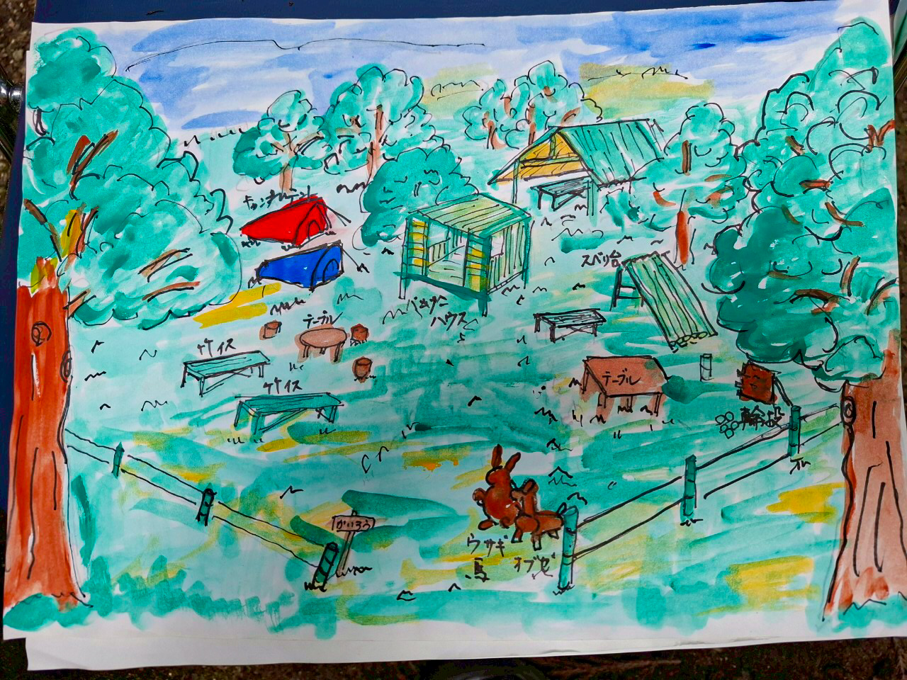 炭焼きの火の前で参加者で話し合った内容を描いたイメージ図(初案)のことを、あれこれ話す時間はとても贅沢な時間でした。