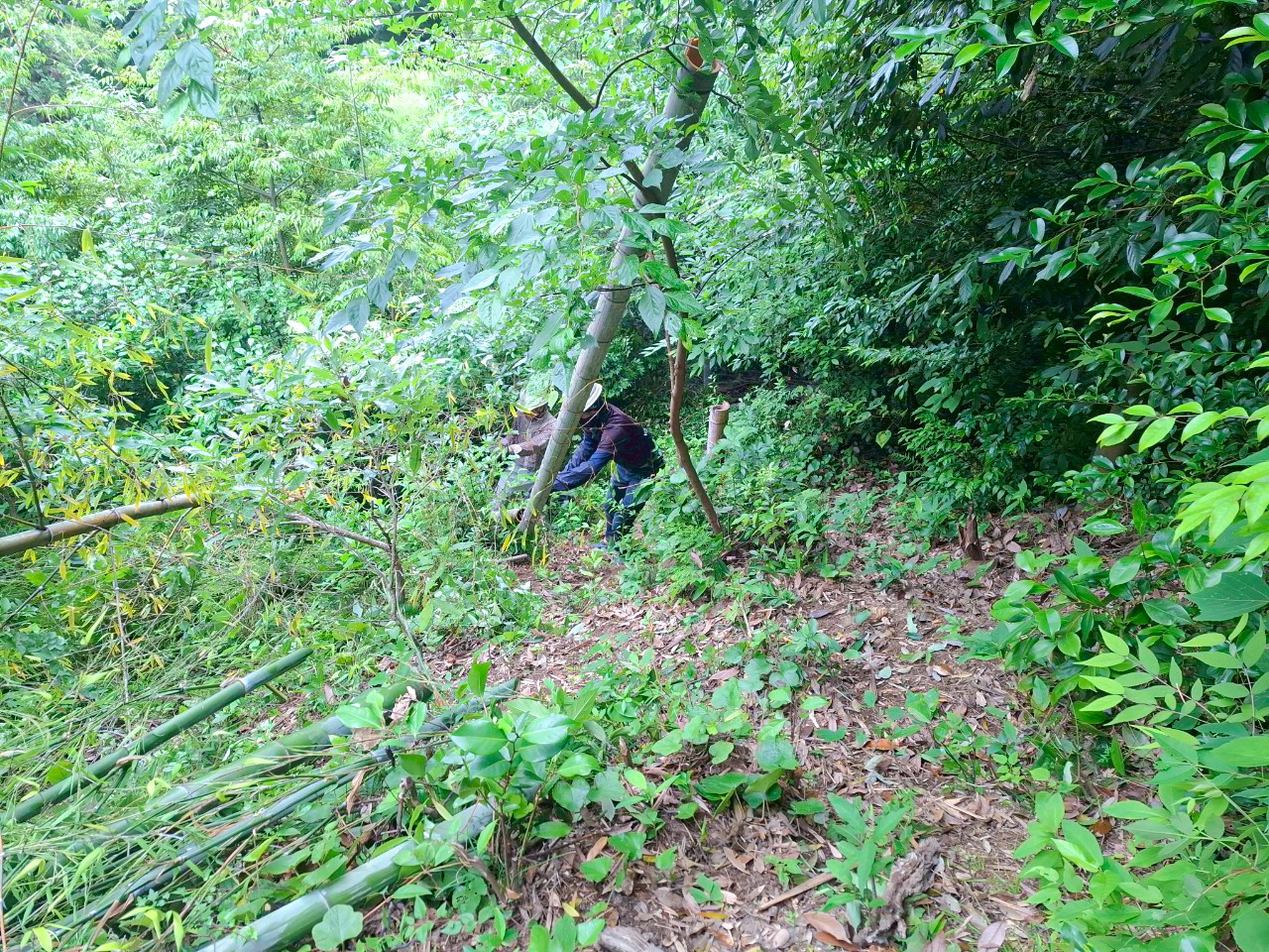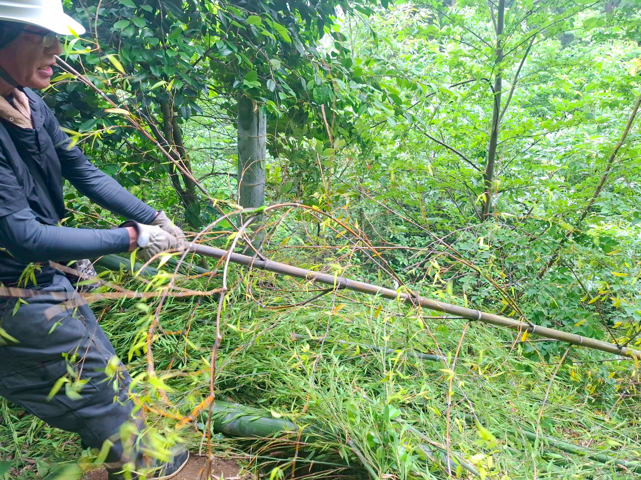 もともとは自衛隊OBの方々で始まった団体とのこと。事前にお聞きしていた年齢を感じさせず、びっくりするほどのご健脚です。現場での打ち合わせの後、道具を手にすっと山の中に消えていきます。しばらくしたら、「倒すよー」「おーらい」と幾度かの声掛けが響いたあと、竹がバサバサっと倒れてきます。