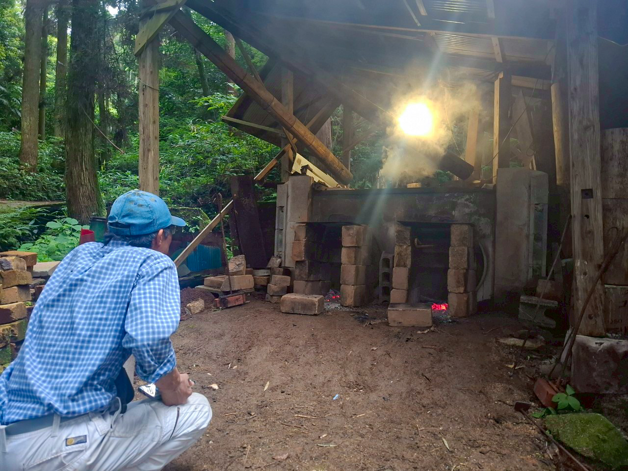 日が沈み、耳を澄ませば隣を流れる沢の音に火のはぜる音が混じりました。山麓で源流を感じながら丁寧な暮らしというものを考えます。窯内部の様子を想像し、煙と音、温度計の数字を見ながら空気を遮断するタイミングを見極めます。作業時間自体が癒しの時間なのかもしれません。