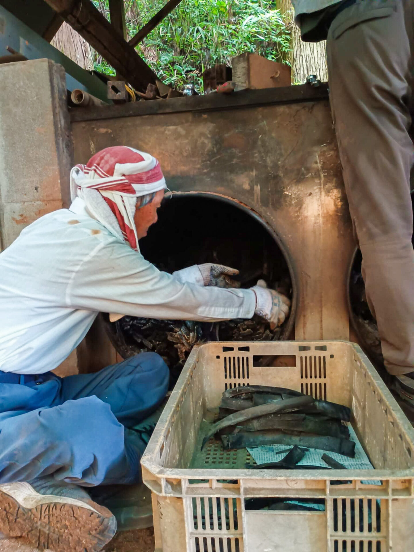 窯から上がる煙の量や色を見ながら、中の様子を説明していただきました。何度焼いても同じにならず、出来上がった竹炭の良品は20%前後とのこと。難易度が高く、奥が深い炭焼きの面白さが伝わってきます。