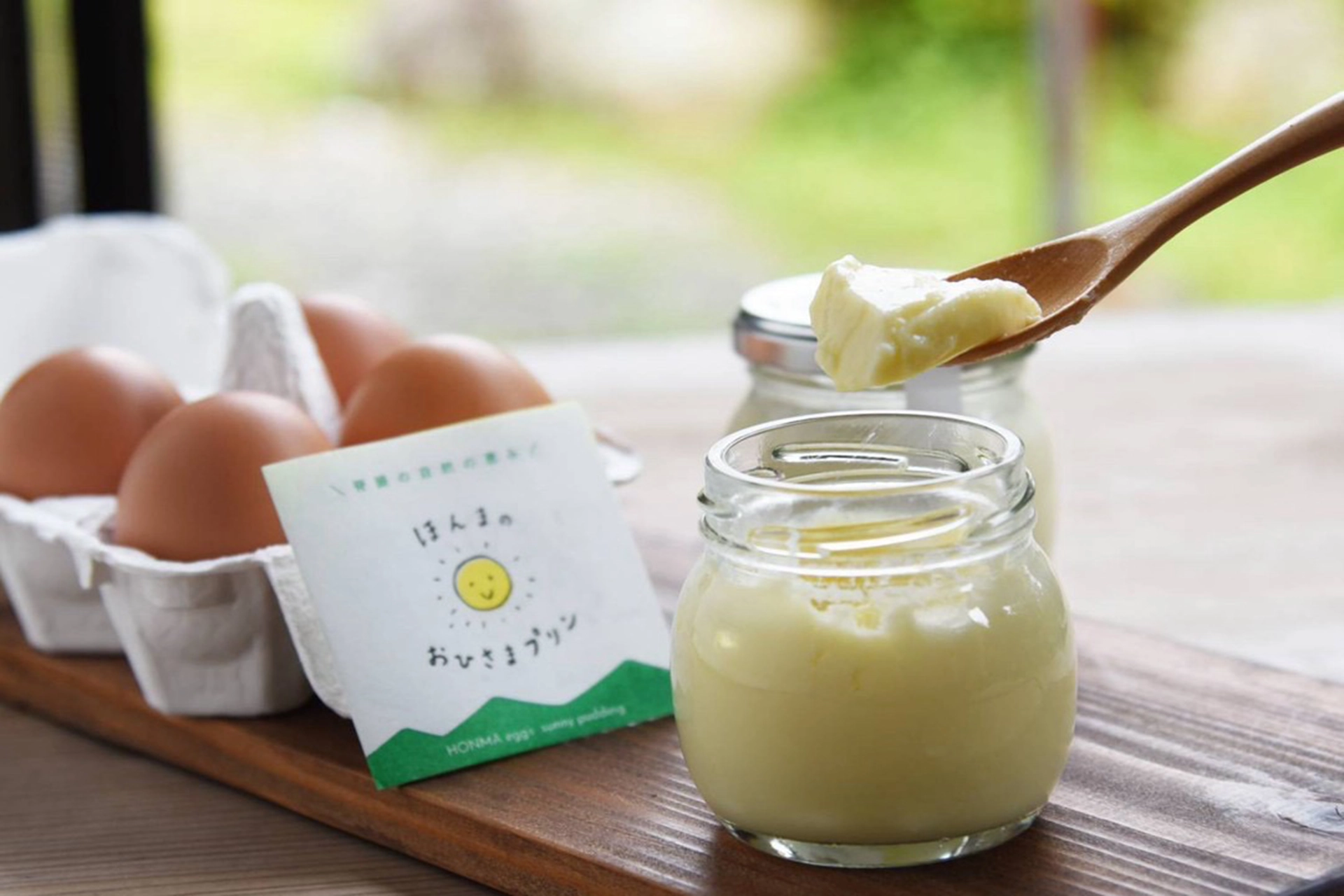 脊振の森の中でのびのびと育った鶏の平飼い有精卵を生産している本間農園の直売所。 卵や卵を使ったスイーツなどを販売しています。