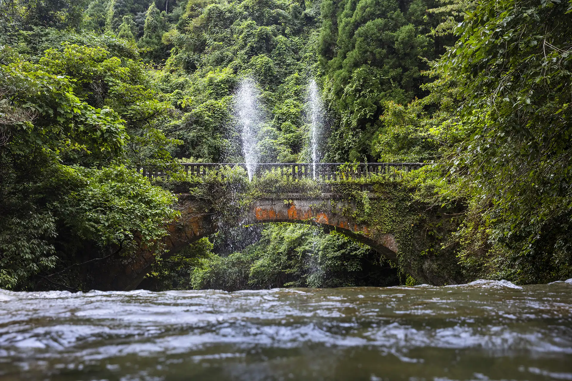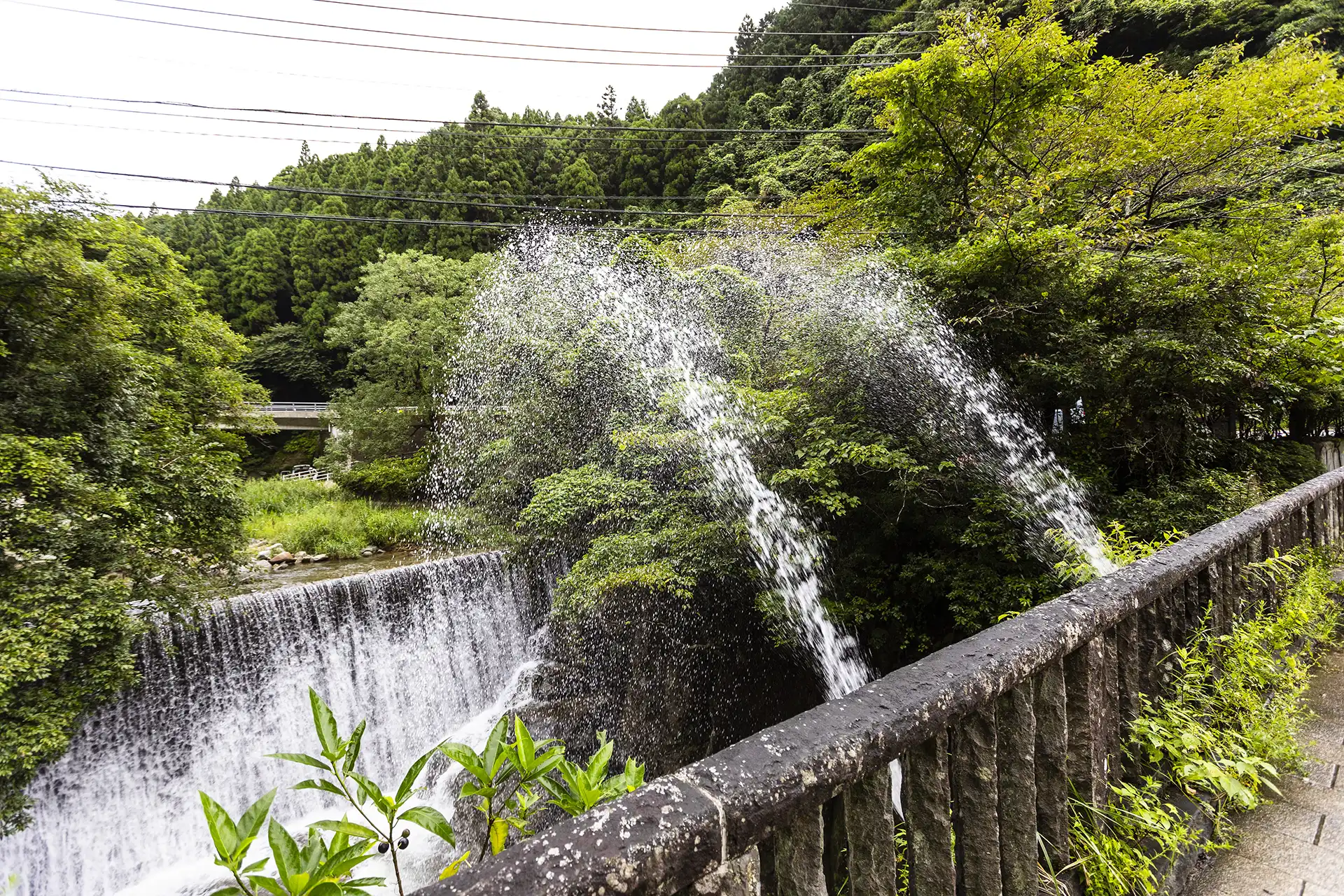 城原川の脊振渓谷にある石橋。橋の欄干から噴き出る水「恵みの流水」は、訪れる人たちへの贈り物と言われています。石橋は明治時代に作られたもので、現在は神埼市の重要文化財に指定されています。桜やあじさいの名所としても知られています。