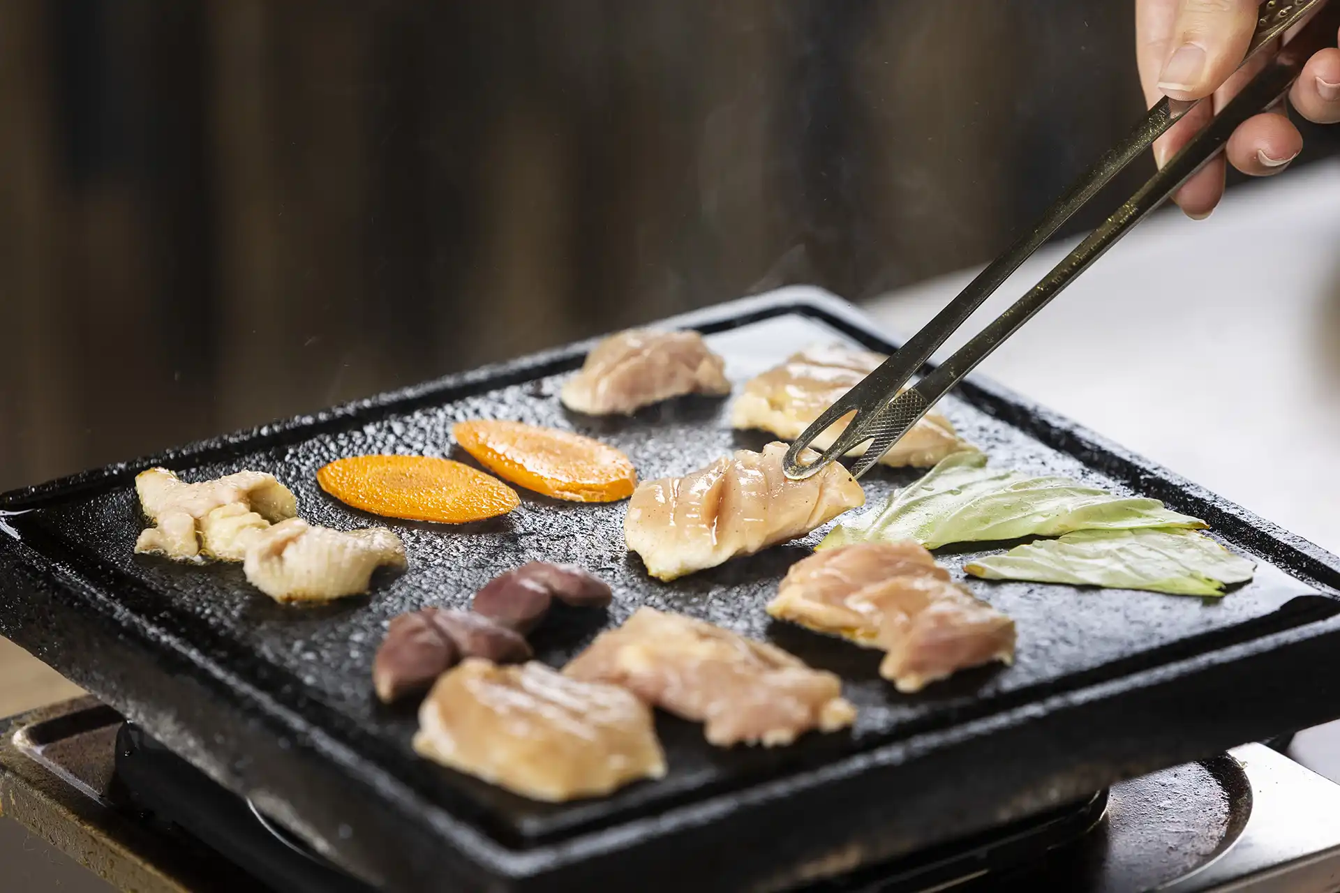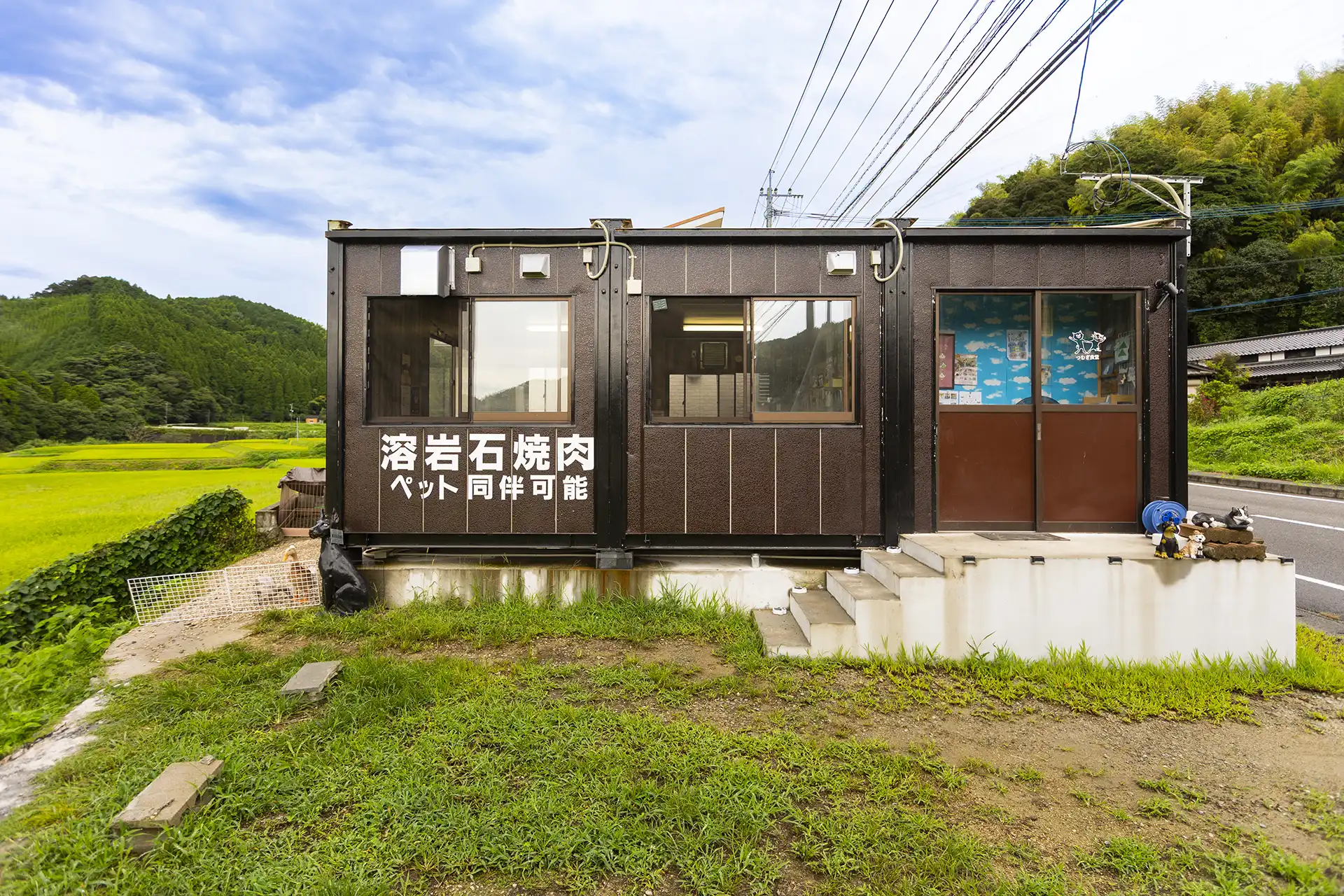 脊振山のふもとにある鶏肉メインの溶岩石焼肉店。佐賀のブランド鶏「ありたどり」や農園から直接仕入れた新鮮な野菜をセルフで溶岩焼にして食べることができます。また、本間農園の平飼い有精卵の卵かけごはんや、とんぼ農園のほうれん草を使ったスープやサラダといった、脊振町の食を楽しめるのも特徴です。