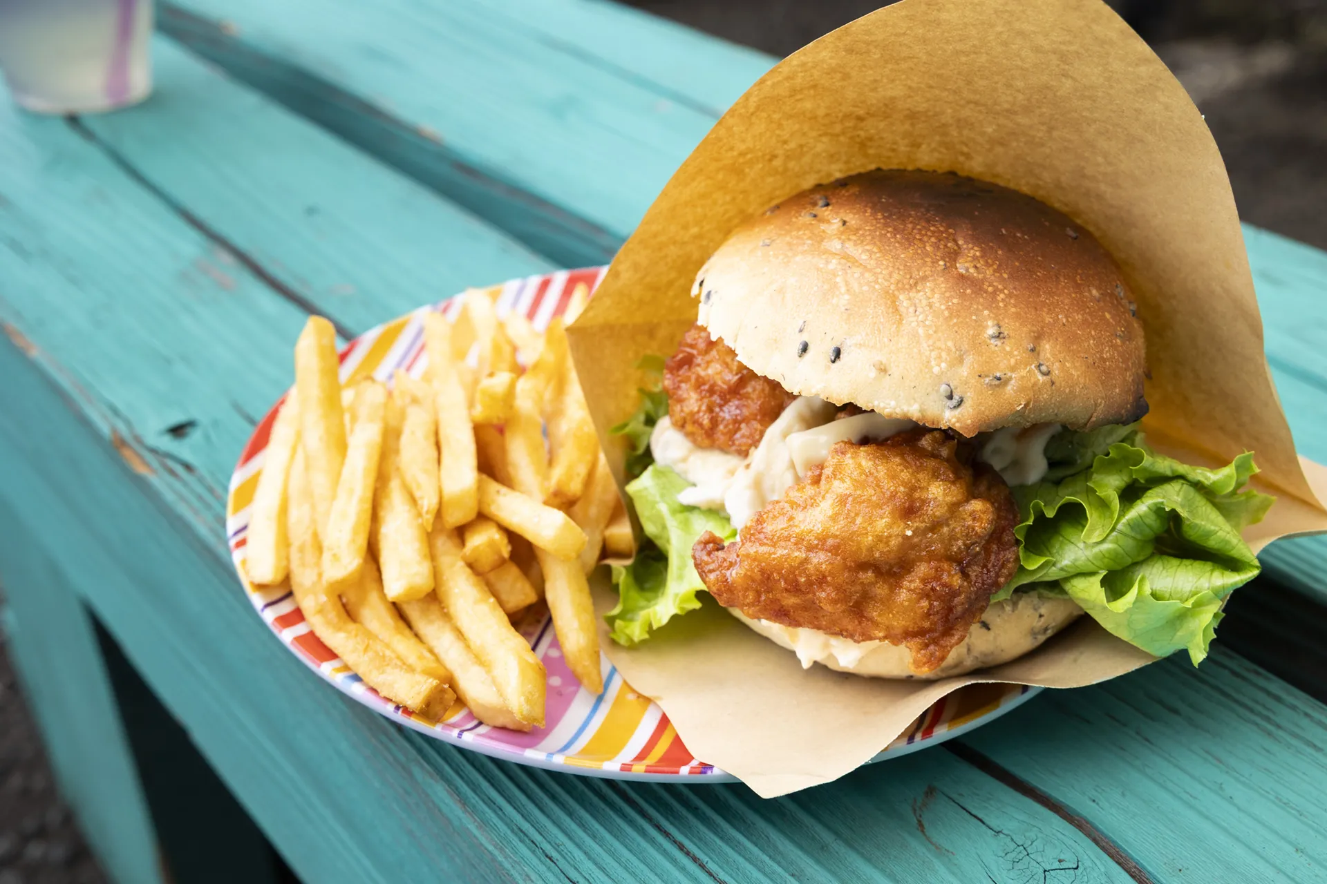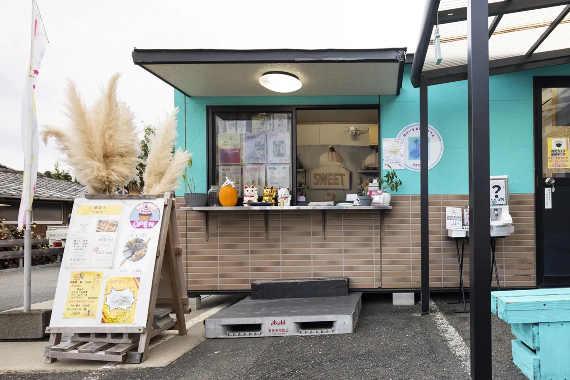 2025年にオープンしたスイーツ&惣菜カフェ「あじさい」。アイスクリームや回転焼きなどのスイーツをはじめ、串揚げやハンバーガーといった惣菜・軽食が楽しめるスポットです。テイクアウトはもちろん、外のイートインスペースでゆっくり過ごすこともできます。飲食店での経験豊かなオーナーが作るフードは、見た目も味も楽しいメニューが揃います。パーティー用オードブルの注文にも対応しており、基山町の憩いの場として地域の人々にも親しまれています。