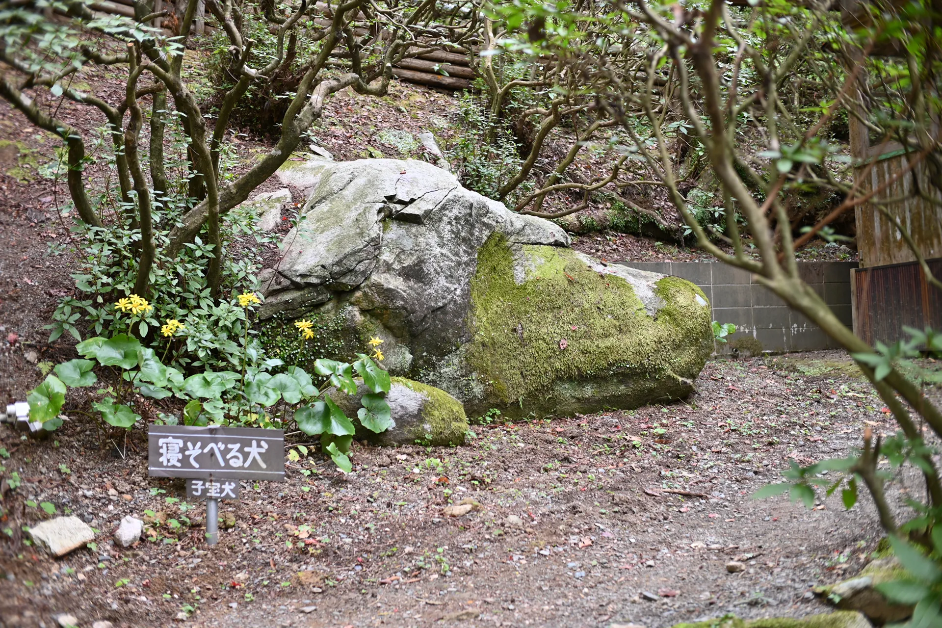 その名の通り、寝そべった犬の横顔のような形をしたこのユニークな石は、庭園の静かな雰囲気の中で訪れる人の目を引きます。