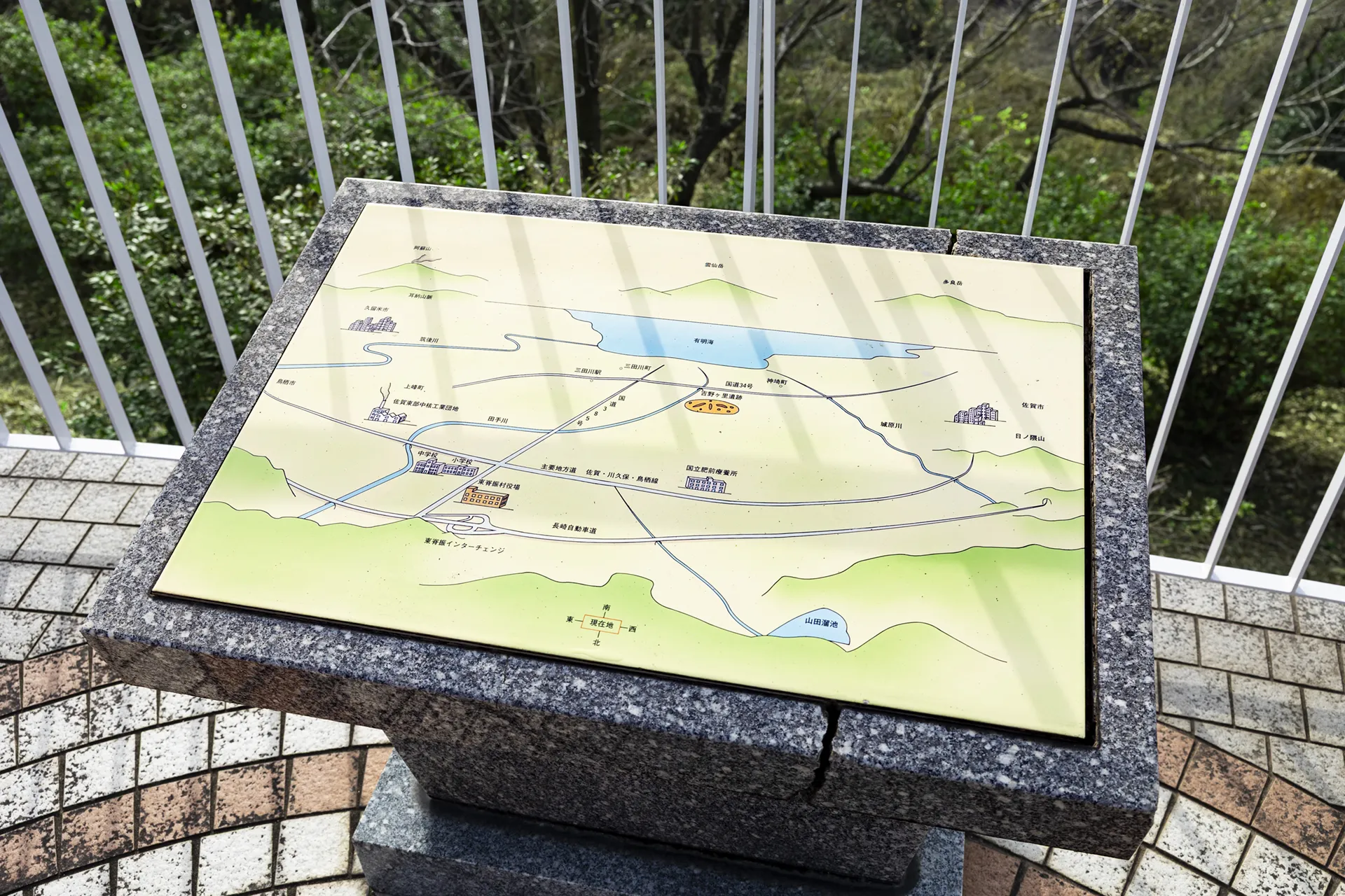 村制100年記念塔は、吉野ヶ里の高台に立つランドマークとして、地域の歴史と広がりを感じられる場所です。塔に設けられた展望台からは、平野の先に広がる有明海をはじめ、天候の良い日には阿蘇山、雲仙岳、多良岳まで見渡すことができます。 山と海、そして平野が連なる雄大な眺望は、この土地が育んできた時間のスケールを実感させてくれます。昼と夕暮れ、そして夜へと移ろう景色の変化も魅力のひとつです。