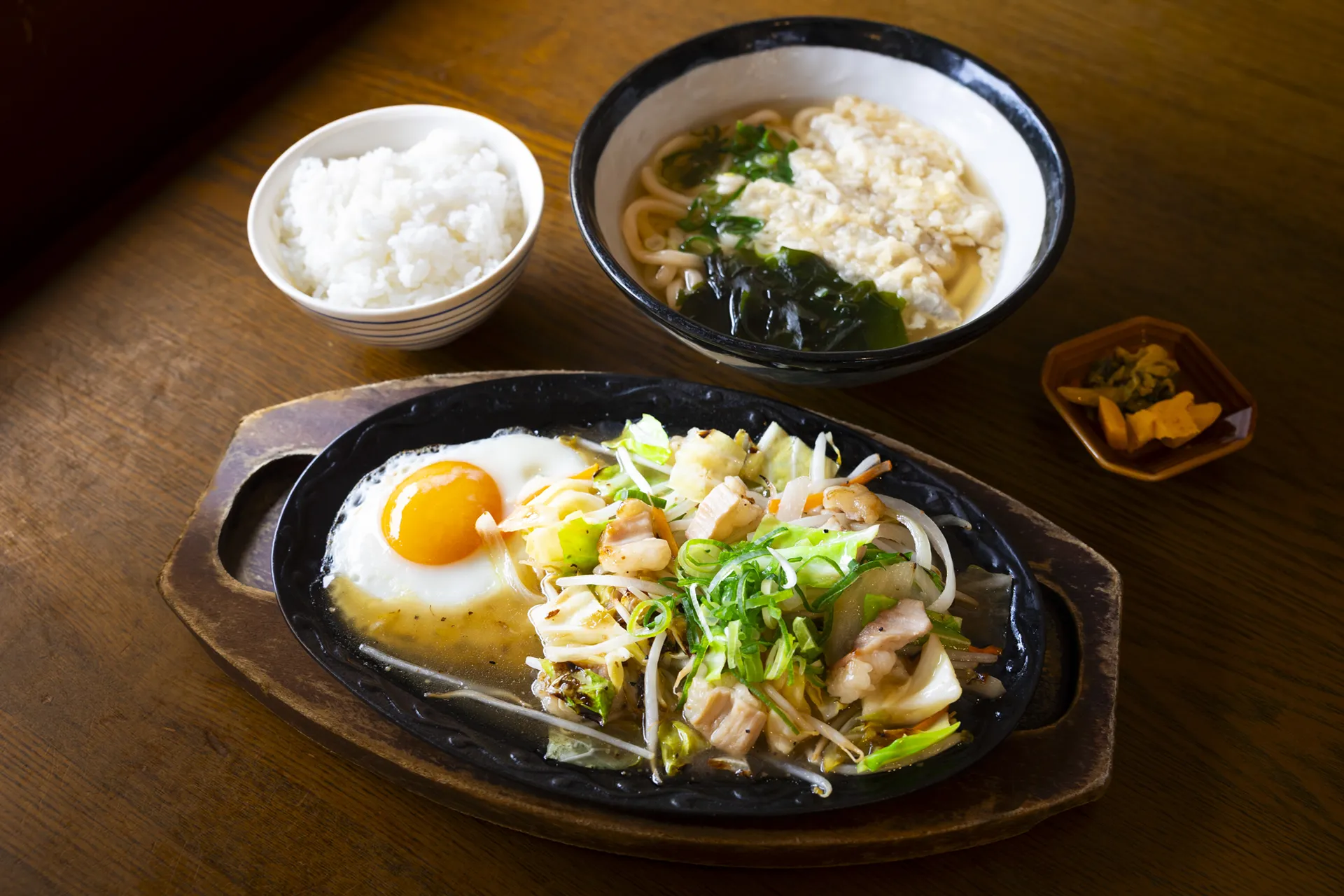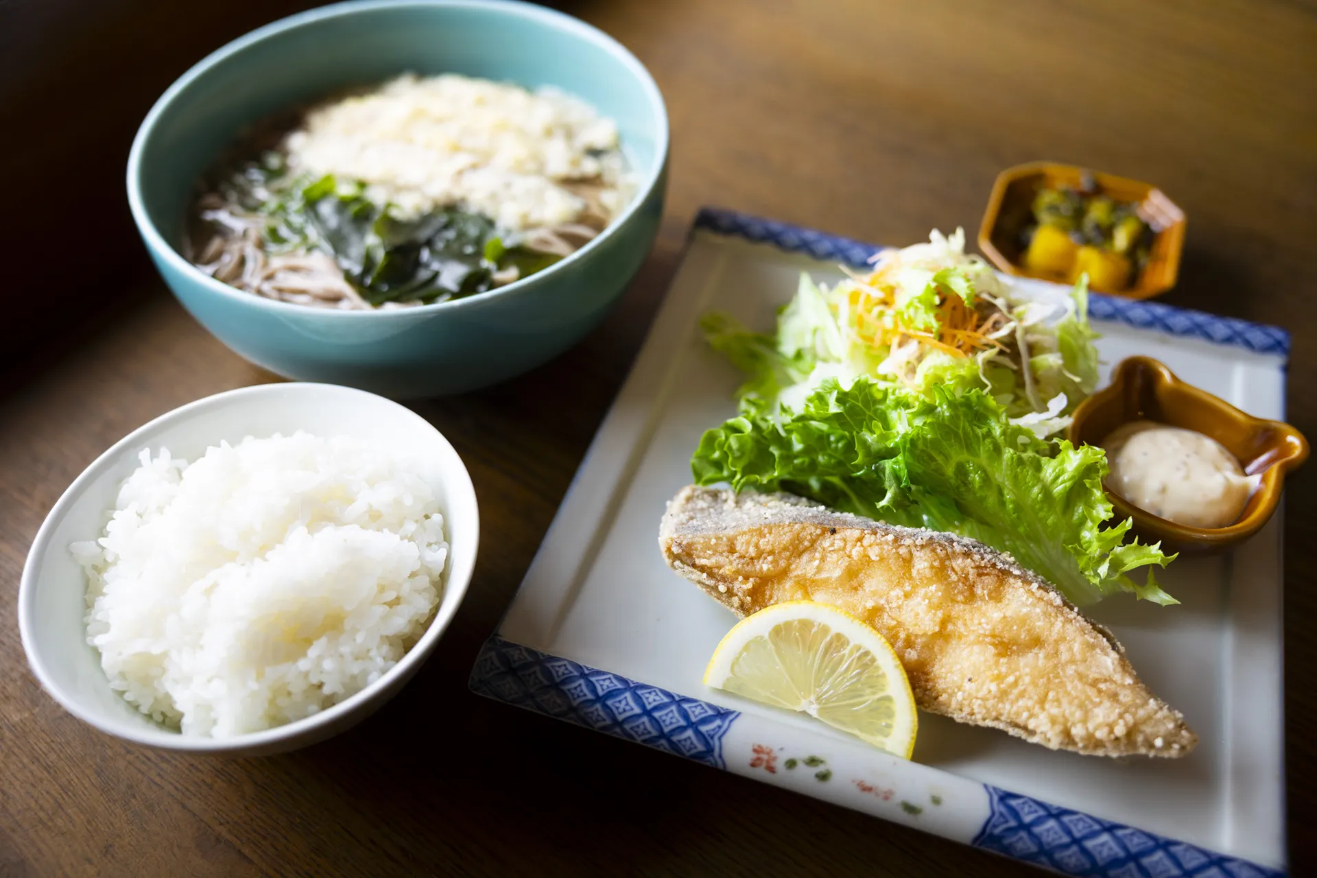 魚バター焼そば定食。(うどんかそばを選べます)香ばしく焼き上げた魚の旨みとバターのコクがじんわり絡む一品。定食ならではの満足感もあり、しっかり食べたいときにおすすめ。